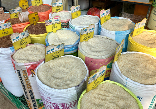 Large-scale rice distribution, grains, and essential food staples.
